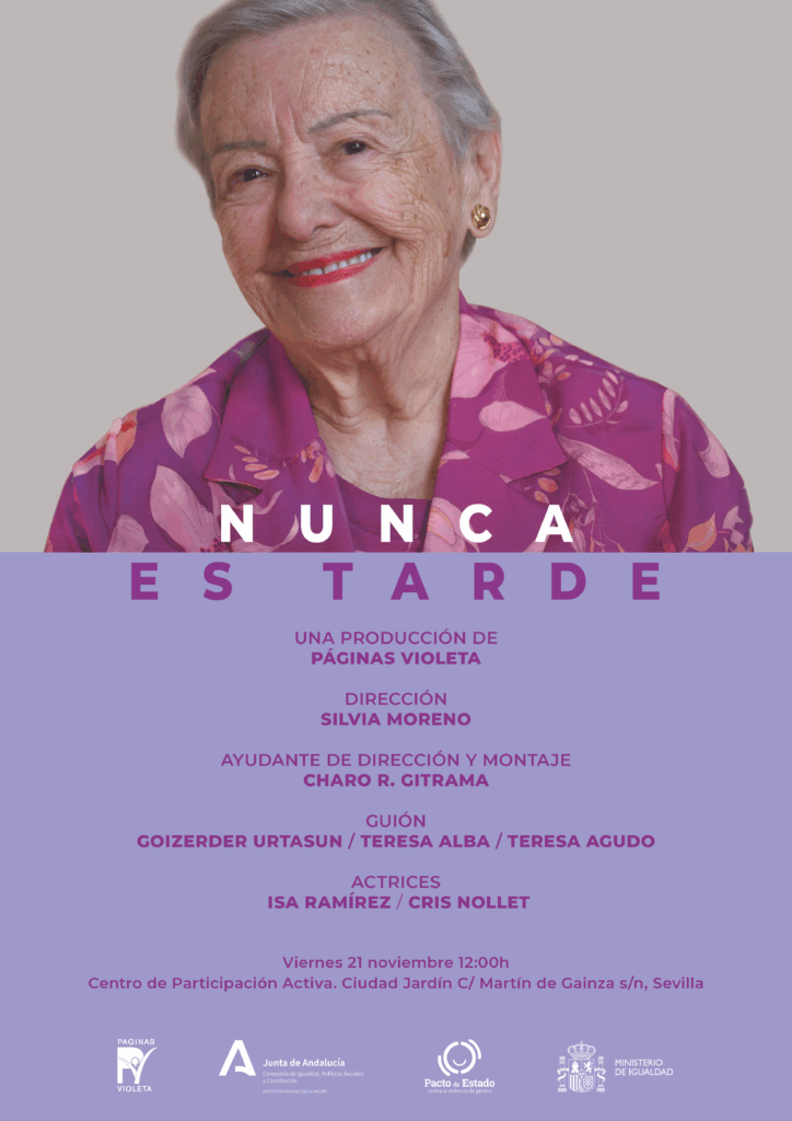 Con motivo del 25N, Día Internacional para la Eliminación de la Violencia contra las Mujeres, desde la Asociación Páginas Violeta seguimos impulsando espacios de reflexión y diálogo a través del cortometraje “Nunca es tarde”, que aborda las múltiples discriminaciones y violencias de género a las que se enfrenta el colectivo de mujeres mayores, así como la invisibilidad de esta realidad en campañas publicitarias y medios de comunicación.