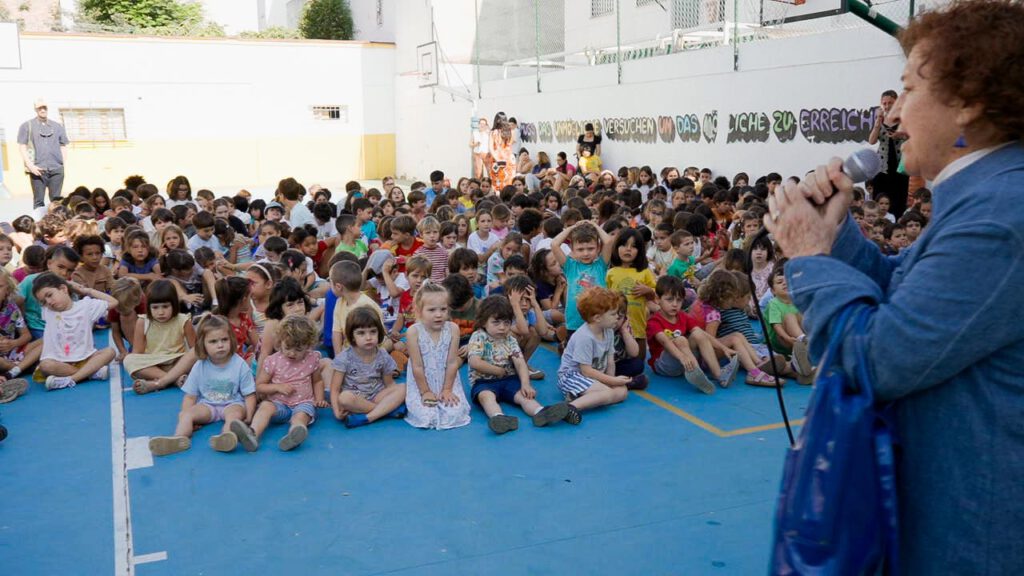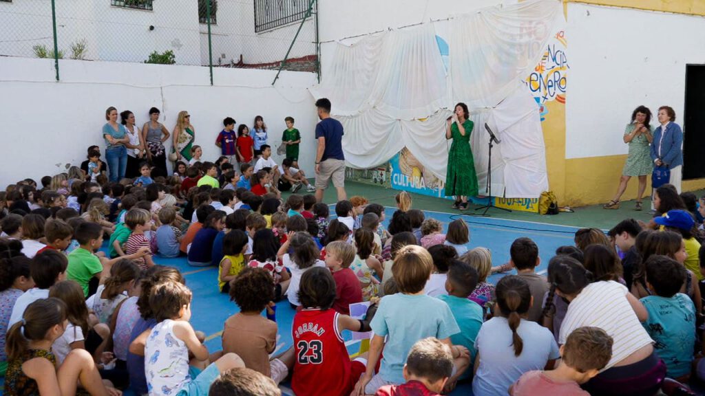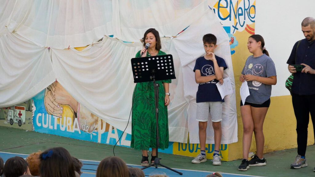 Teresa Alba, presidenta de Páginas Violeta, impartió un taller al alumnado de 6º de Primaria, haciendo un recorrido por los conflictos bélicos actuales y la situación de las personas desplazadas en campamentos gestionados por la comunidad internacional, especialmente por Naciones Unidas y diversas ONGs. La sesión se centró especialmente en los efectos que las guerras tienen sobre las niñas, las jóvenes y las mujeres en general.