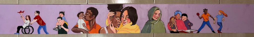 El mural, ubicado en una pared exterior del colegio, transmite un mensaje claro y permanente: